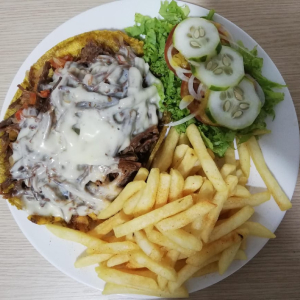 Patacón con carne o pollo desmechado.