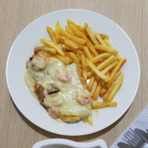 Camarón al ajillo y salsa blanca, ensalada, arroz y platano maduro