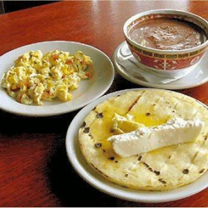 (arepa, quesito, huevo, carne ó chicharrón y chocolate o café)